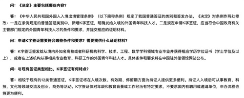 其中新增加了关于K字签证的条例,此签证发给入境的外国青年科技人才。