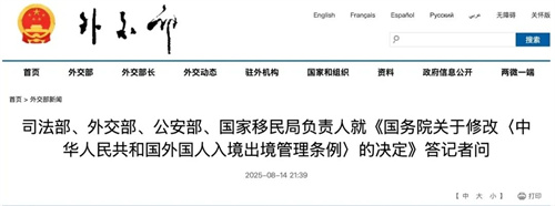 2025年8月7日,国务院总理签署第814号国务院令,公布《国务院关于修改〈中华人民共和国外国人入境出境管理条例〉的决定》,自2025年10月1日起施行。 (图源外交部,版权属于原作者)