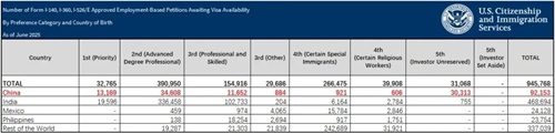近期,美国公民及移民服务局(USCIS)正式公布2025财年第三季度各移民类别的相关统计数据。所有职业移民相关数据:按优先类别和出生国家划分的已获批准但正等待签证名额的就业类移民申请数量:主要职业移民类别出现 ...