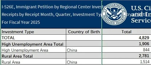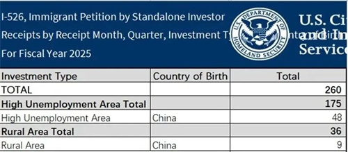 区域中心项目(I-526E): 直投I-526: 数据显示,2025财年中,在高失业率和乡村项目这两个类别中,中国大陆的申请量占比已经超过了全球数量的40%,和同处于旧政EB-5排期中的印度一起,成为预留签证项目中,申请量占比最大的两个国家。