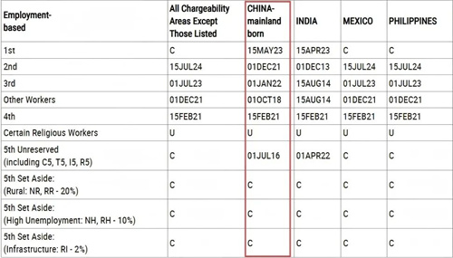 • EB1(杰出人才)原地踏步,停在2023年5月15日; • EB2(NIW)原地踏步,停在2021年12月1日; • EB3(技术劳工)原地踏步,停在2022年1月1日; • EB3非技术劳工(EW-3)原地踏步,停在2018年10月1日; • EB4(特殊人员)停用; • EB5(区域中心)原地踏步,停在2016年7月1日; • EB5(乡村、高失业地区、基建项目)继续无排期。