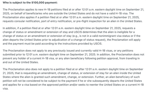 这次改革后能真正筛选掉那些违规申请人,让有限的移民资源回归,促进移民排期加速往前移动。 除了以上EB-1A、NIW、EB-2的改革,从今年9月开始,一直备受争议的H-1B签证10万美元申请费也迎来了新进展。