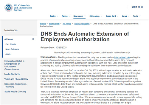 美国国土安全部(DHS)10月29日突然投下重磅炸弹:自10月30日起,绝大多数EAD工卡续签将不再享受自动延期福利。这意味着,数百万在美工作、生活的移民将面临工作身份中断的风险。 ...