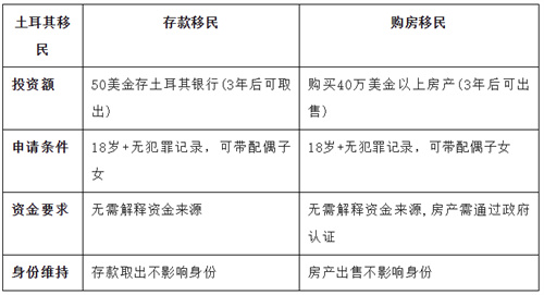 土耳其移民这两种方式,小编觉得各有道理。以下是土耳其存款移民vs购房移民申请条件对比图 •投资要求简单易操作,仅需在土耳其银行定存50万美元,存期3年即可满足入籍要求。