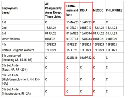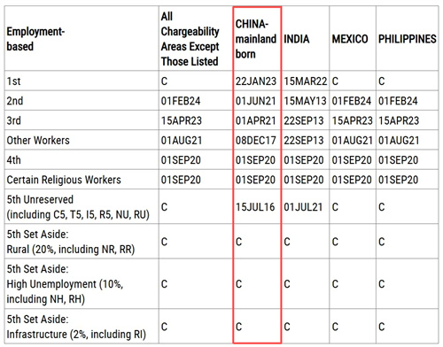 • EB-1: 2023年1月22日,前进31天; • EB-2(NIW): 2021年6月1日,前进61天; • EB-3技术类: 2021年4月1日,前进31天; • EB-3非技术: 2017年12月8日,前进7天; • EB-4特殊移民:2020年9月1日,前进62天; • EB-4宗教移民:不可用; • EB-5直投及区域中心:2016年7月15日,前进220天; • EB-5预留签证类别:无排期;