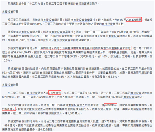 一是香港特区政府统计处数据,2024年香港外来直接投资总量达20万496亿港元,同比增加9824亿。