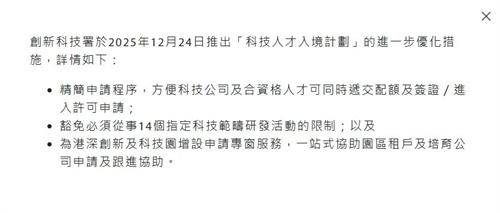 同时有配额限制,符合资质的公司需申请配额,才可协助合资格科才申请工作签证。 本次创新科技署的三项便利措施如下: