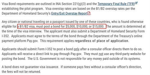 最初试点计划实施时,仅包括13个被认为“非法滞留风险较高”的国家,其国民在申请B1/B2签证时可能会被要求缴纳保证金。
