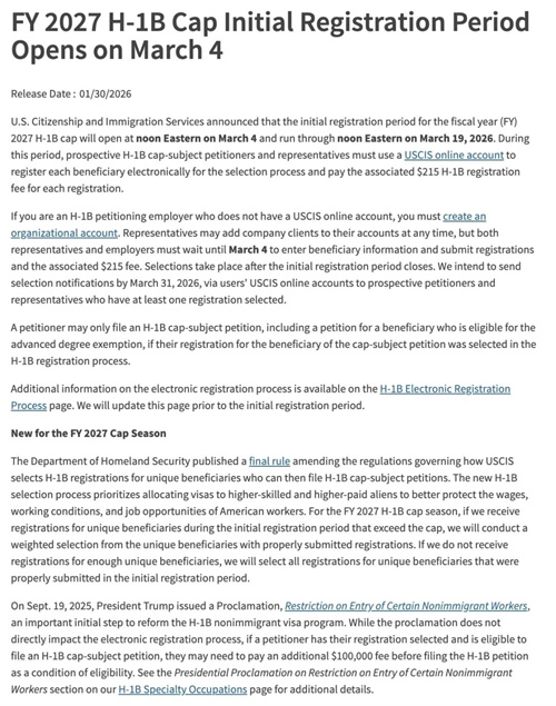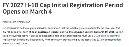 美国当地时间1月30日,美国移民局(USCIS)宣布了2027财年H-1B抽签类签证的电子注册安排: