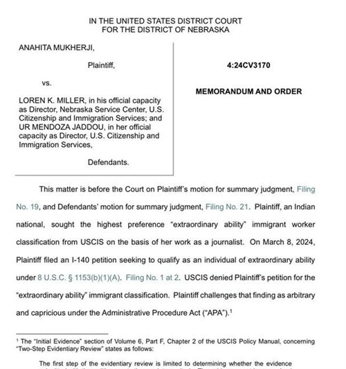 原告是一位印度籍的记者,她提交了EB-1A申请,并且移民局自己也承认她满足了法律规定的至少五项标准(实际上只需要满足三项即可)。