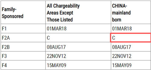 ·F1类(公民21周岁以上未婚子女)前进181天,来到2018年3月1日; ·F2A类(绿卡配偶及21周岁以下子女)无需排期; ·F2B类(绿卡21周岁也上未婚子女)前进146天,来到2017年8月8日; ·F3类(公民21周岁以上已婚子女一家)前进123天,来到2012年11月22日; ·F4类(公民兄弟姐妹)前进75天,停在2009年5月15日。