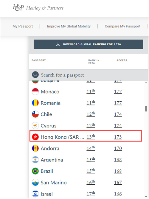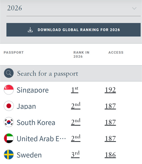 近日,有着20年历史、被誉为全球护照流动性“金标准”的恒理(亨利)护照指数2026年排名正式揭晓。